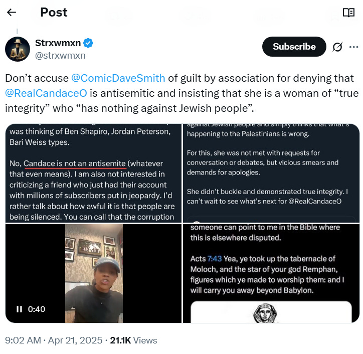 Alex, I do not always agree with you, and my comments reflect that, but I respect you're putting yourself on this platform and connecting with your readers. Tonight was a train wreck. Before this spat, I had no idea who Dave Smith was, and TBH, I still don't. His aggressive, mocking, hateful, and anti-gay rhetoric was so over the top it became unwatchable. I stopped after about fifteen minutes. I am as MAGA as I think anyone can be. With that said, I do not know how anyone on the right can tolerate someone like him. I do believe you still need to answer for your continuing belief in The NY Times and the international desire to somehow make Israel responsible for feeding those whom Hamas is starving.