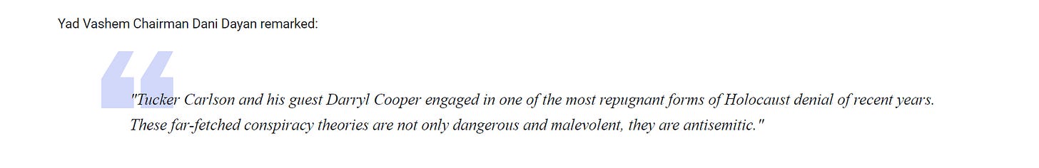 Yad Vashem, the world Holocaust remembrance center, called Cooper a Holocaust denier regurgitating antisemitic theories after his interview with Tucker Carlson last year. It pains me to admit this, because Tucker supported me during Covid – and in fact he’s been something of a friend to me over the years – but they said Tucker had denied the Holocaust too.