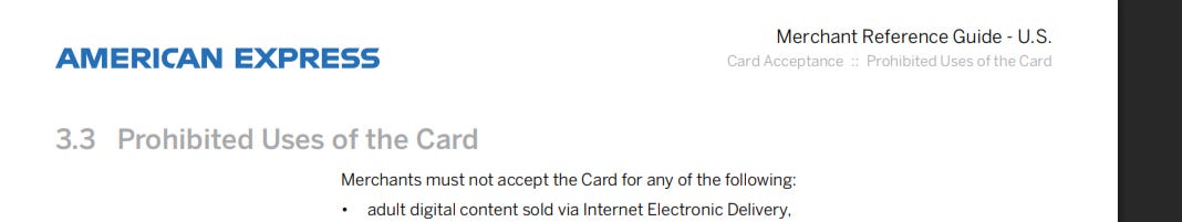 I still can’t be sure why Amex decided to flag my reporting. Notably, however, the first prohibition in its “Merchant Reference Guide” — even before fraudulent sales — is for “adult digital content sold via Internet Electronic Delivery.”