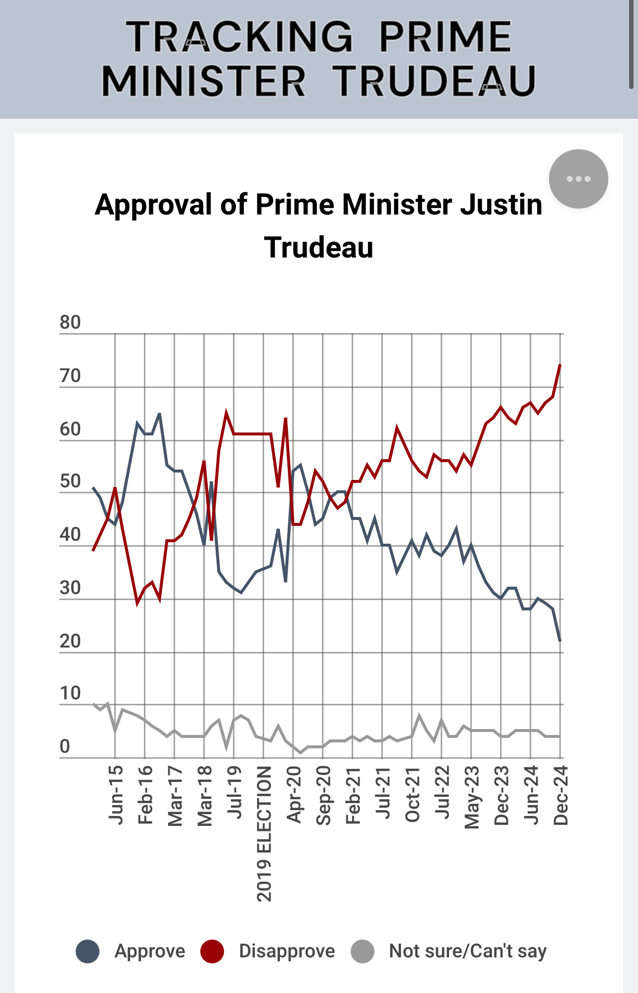 Perhaps the biggest surprise is that Trudeau lasted so long. His approval ratings are now even worse than Joe Biden’s; 74 percent of Canadians say they dislike him.