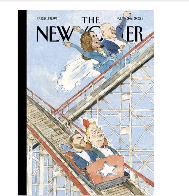 (The New Yorker’s “Roller Coaster” cover, from mid-August 2024, as Democratic enthusiasm for Harris neared its peak)