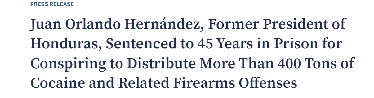 Worse, it comes as President Trump has pardoned the former president of Honduras, whom American jurors convicted last year of taking multi-million dollar bribes to help traffic 400 tons (yes, tons) of cocaine to the United States.