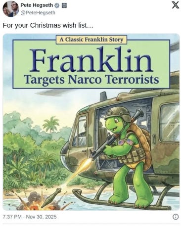 We are not fighting a declared war, and these drug traffickers — if in fact they are drug traffickers and not fishermen we’ve killed by mistake — are not terrorists. Not by any definition. Not in their means or their ends. They don’t have political goals. They aren’t fighting a religious war. They aren’t interested in causing terror among civilians. They are civilian criminals. We ought to catch them and punish them.