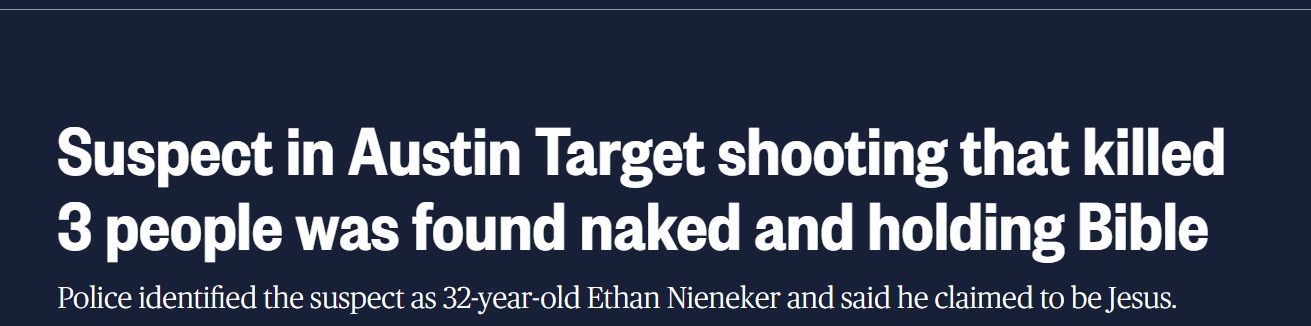 It’s not purposeful. It’s episodic and psychosis-driven and it almost always targets the truly innocent — the family members of the perpetrator, often including children, and random strangers. The seminal domestic version is the mother who kills her kids. The seminal public version is the man who without a word pushes someone in front of an oncoming subway.3