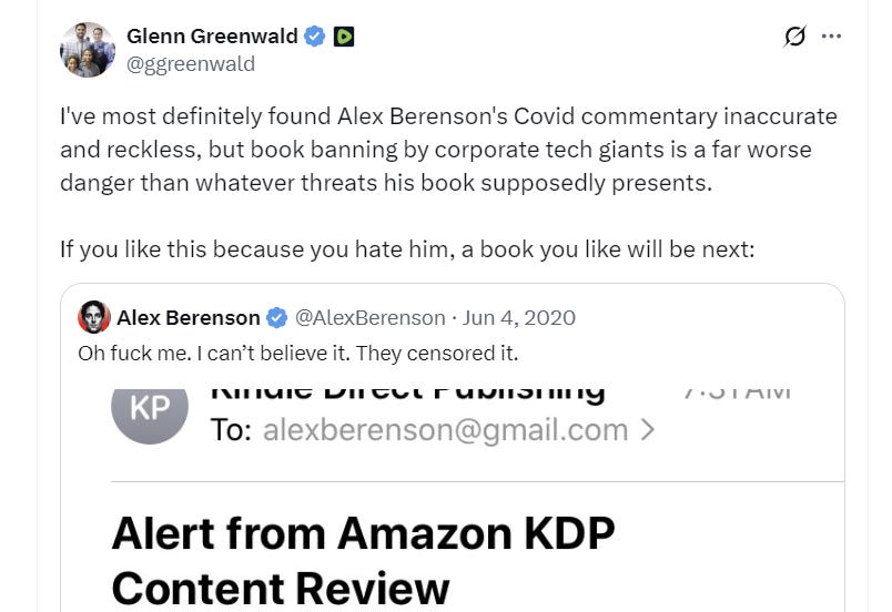 Like me and Matt Taibbi, as the last decade ended and Covid began, he became very concerned about media groupthink and the left’s efforts to use Big Tech companies to silence free speech. When Amazon initially refused to publish my first Unreported Truths pamphlet on June 4, 2020, Greenwald was one of a tiny handful of journalists who spoke out on my behalf. (As you may know, Amazon reversed course after Elon Musk called out Jeff Bezos on Twitter.)