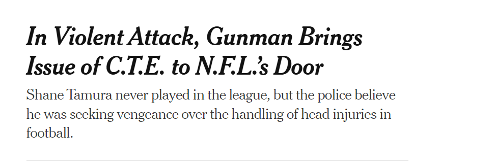 The media — which for a decade has pressed to link football to CTE — eagerly reported the note. “In Violent Attack, Gunman Brings Issue of C.T.E. to N.F.L.’s Door,” the New York Times wrote.