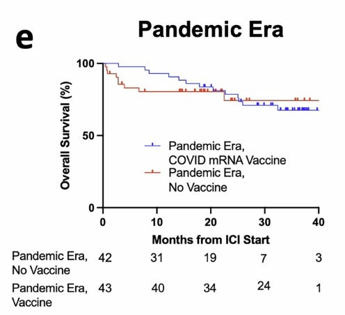 See how the blue line — vaccinated people — has fallen a little lower than the red line by the end? That means fewer vaccinated people have survived - hardly evidence the mRNAs help as a cancer treatment.