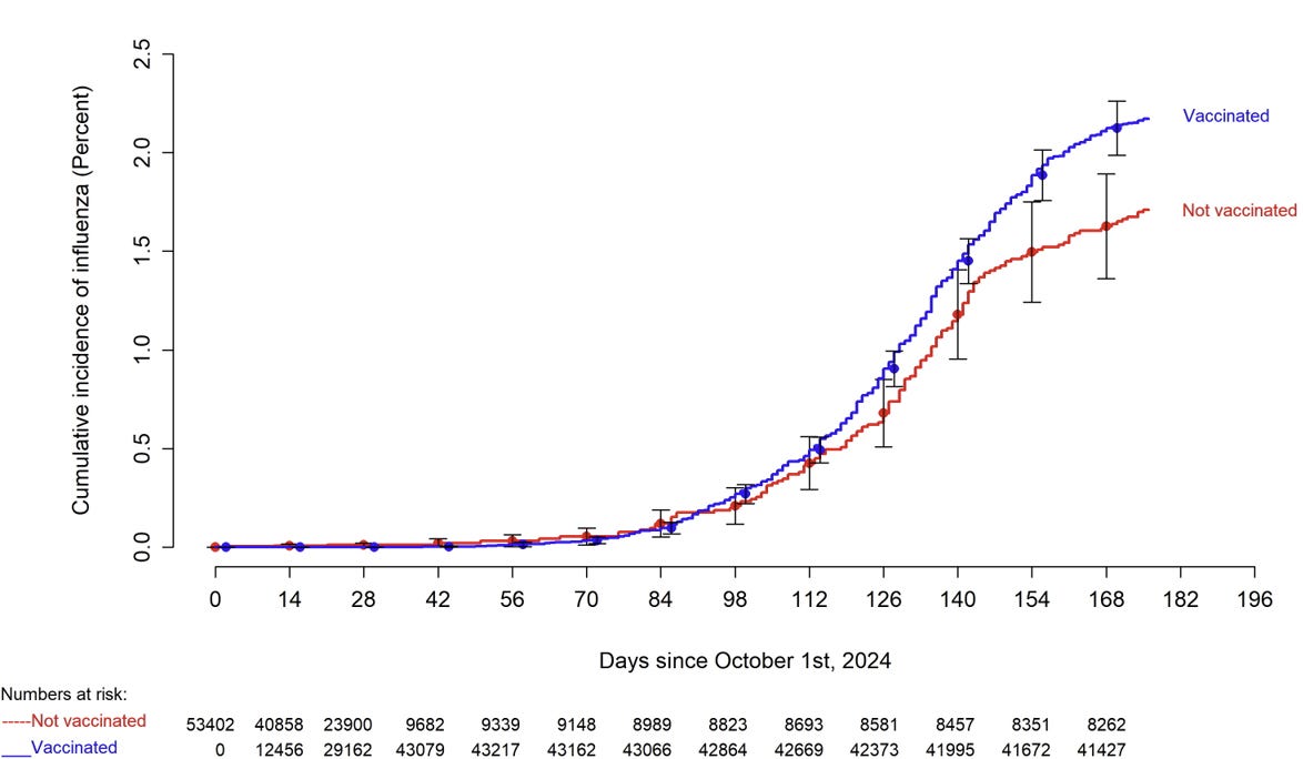They found that by late March 2025, over 2 percent of people who had received the jab had a documented flu infection. Only about 1.5 percent of people who had not gotten the jab had an infection. The gap grew sharply during the last few weeks of the study.