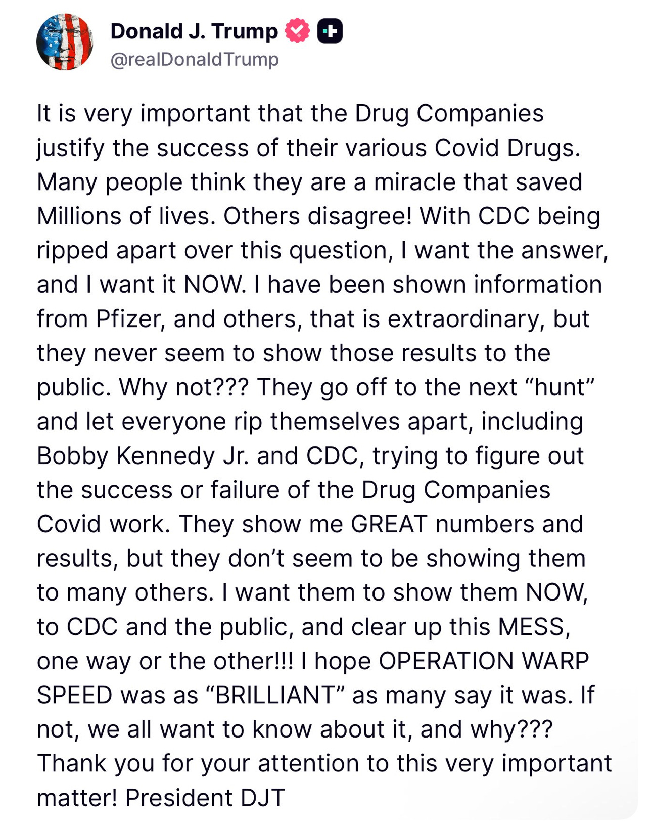 The Covid jab makers “show me GREAT numbers and results, but they don’t seem to be showing them to many others,” he wrote in a post on his Truth Social network. “I want them to show them NOW, to the CDC and public, and clear up this MESS, one way or the other!!!”