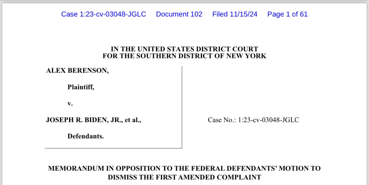 Last month, I asked for your patience as we prepared responses to the defense motions to dismiss Berenson v Biden, my federal lawsuit over the conspiracy between White House and Pfizer officials to censor me in 2021.