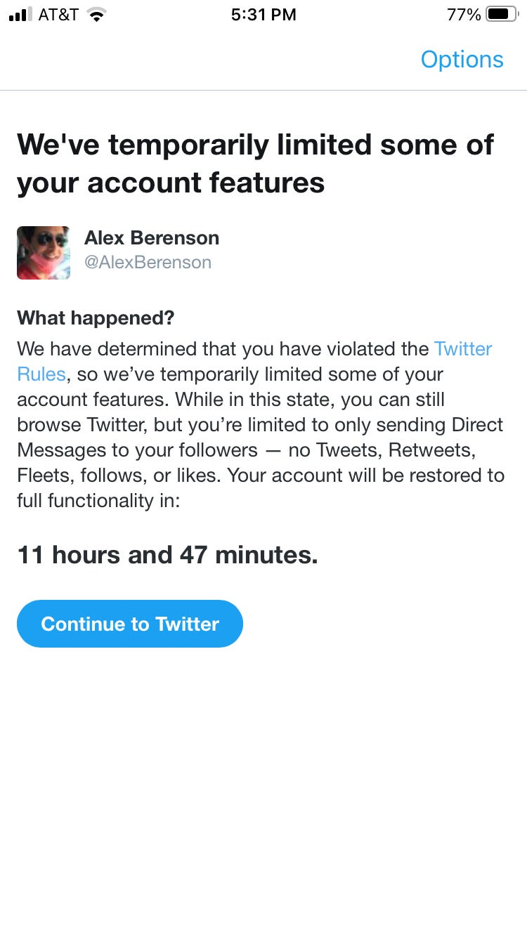 What a warning shot looks likeWhen your ideas can't win, this is what you doAlex BerensonJul 16, 2021∙ Paid297151ShareSo be it. I’ve done nothing except commit journalism the last 18 months. They can kick me off if they like, but they will never shut me down:Continue reading this post for free, courtesy of Alex Berenson.Claim my free postOr purchase a paid subscription.